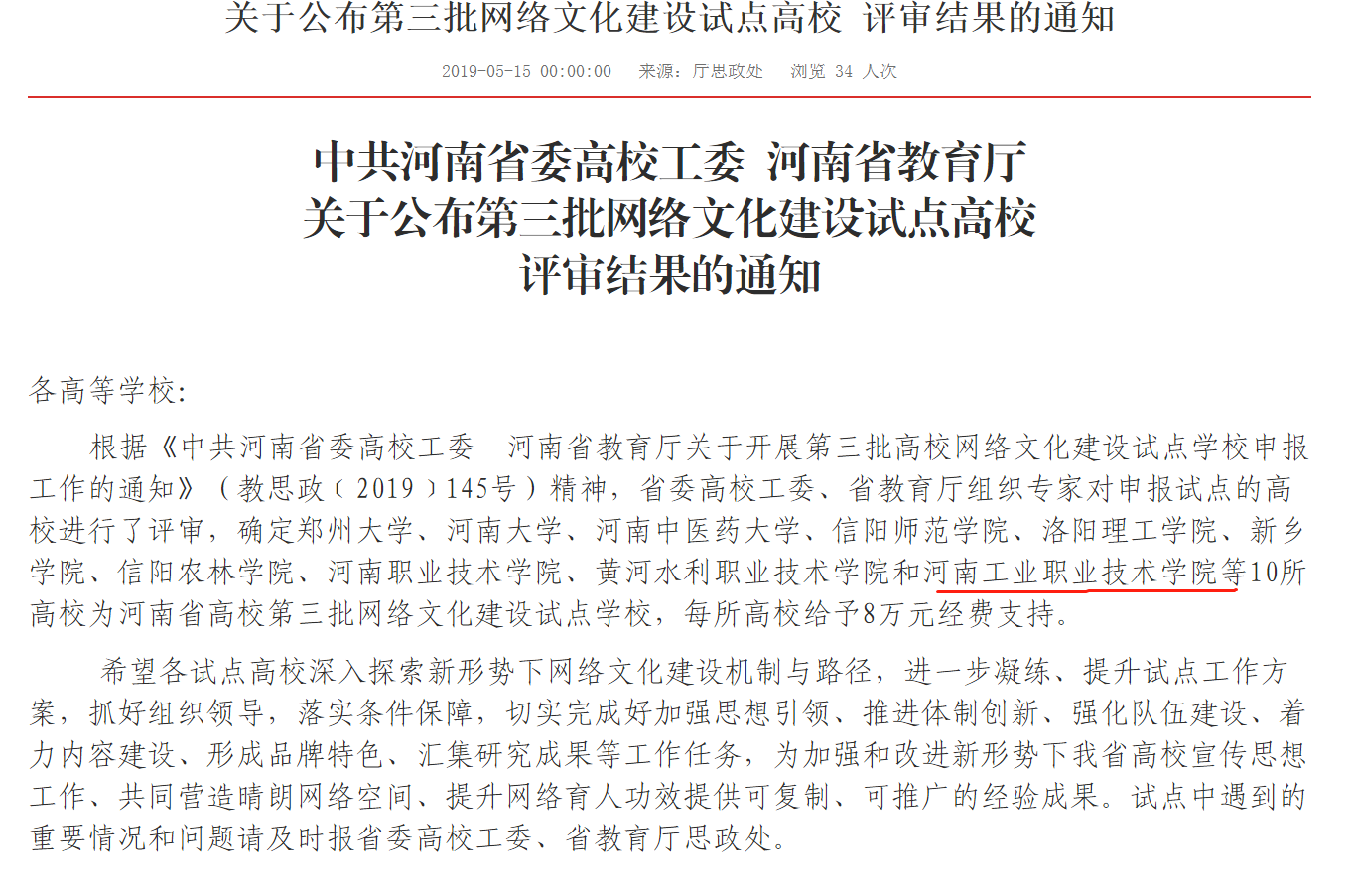 5月15日,中共河南省委高校工委河南省教育厅公布了河南省第三批网络文化建设试点高校评审结果,我校成功入选。按照《中共河南省委高校工委河南省教育厅关于开展第三批高校网络文化建设试点学校申报工作的通知》(