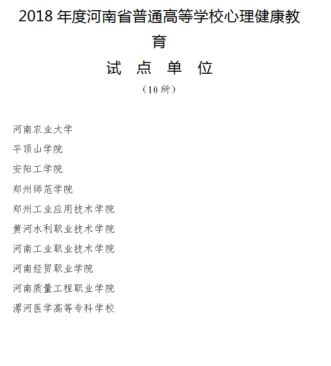 按照《中共河南省委高校工委河南省教育厅关于开展2018年度高校心理健康教育试点单位申报工作的通知》(教思政〔2018〕423号)精神,依据《河南省普通高等学校心理健康教育试点单位建设标准》(试行),省