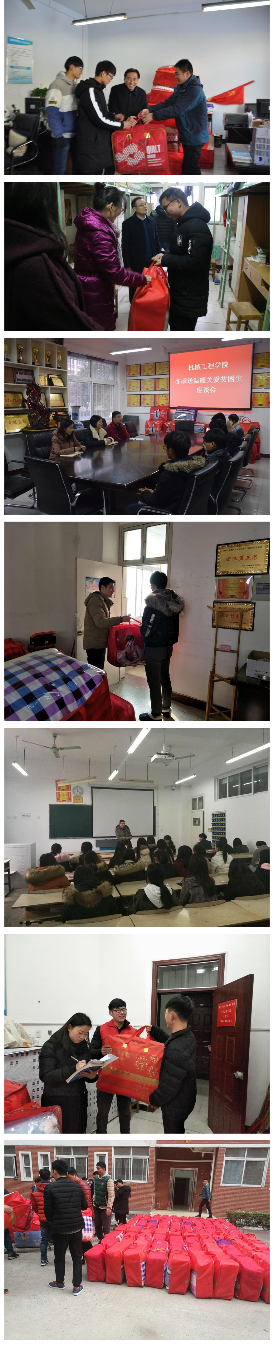 年年寒冬送关爱,情暖学子创和谐。随着天气逐渐转寒,为切实解决家庭经济困难学生的御寒问题,1月15日,我校开展了“冬季送温暖”活动。学生处负责同志、各院系领导、班主任老师深入学生宿舍,将价值约20万元的