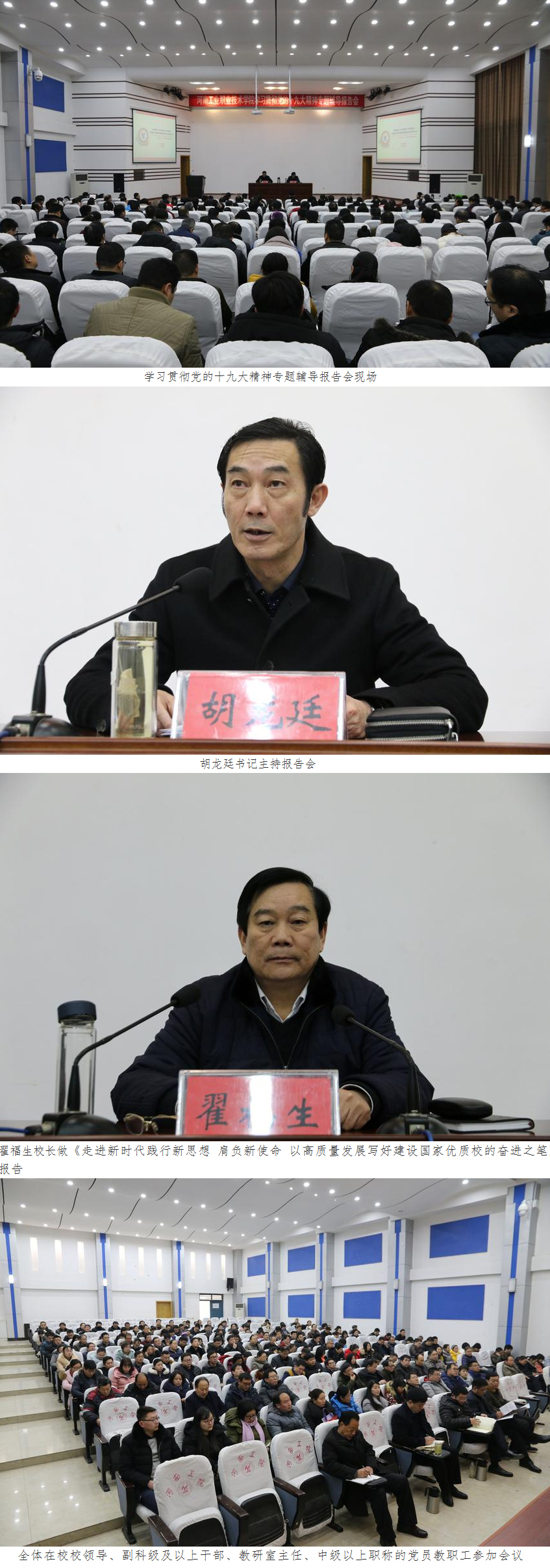 为深入学习贯彻党的十九大精神,根据学校党委《学习宣传贯彻党的十九大精神工作方案》安排,1月2日,学校在孔明路校区大学术报告厅举办学习贯彻党的十九大精神专题辅导报告会。全体在校校领导、副科级及以上干部、