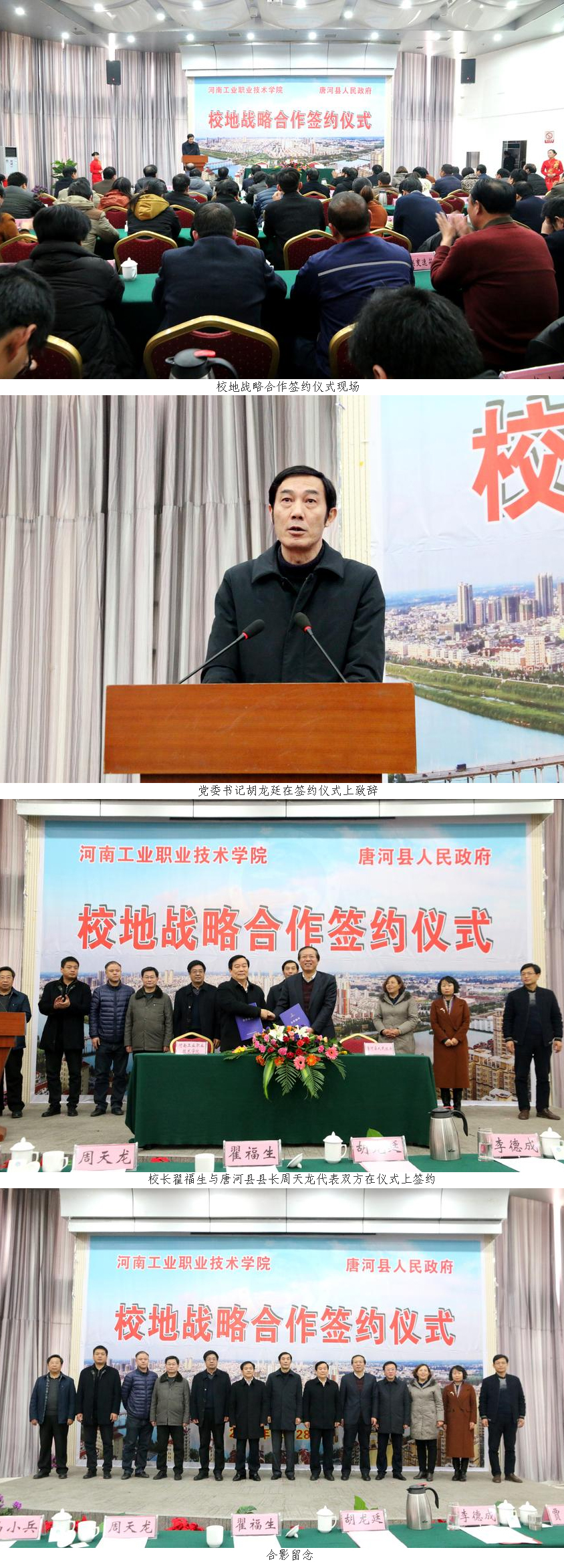 12月28日,我校与唐河县人民政府校地战略合作签约仪式在唐河迎宾馆会议室举行。校党委书记胡龙廷、校长翟福生、副校长贾庆成,唐河县委书记李德成,县委副书记、县长周天龙,县委常委、组织部长赵阳,副县长马俊