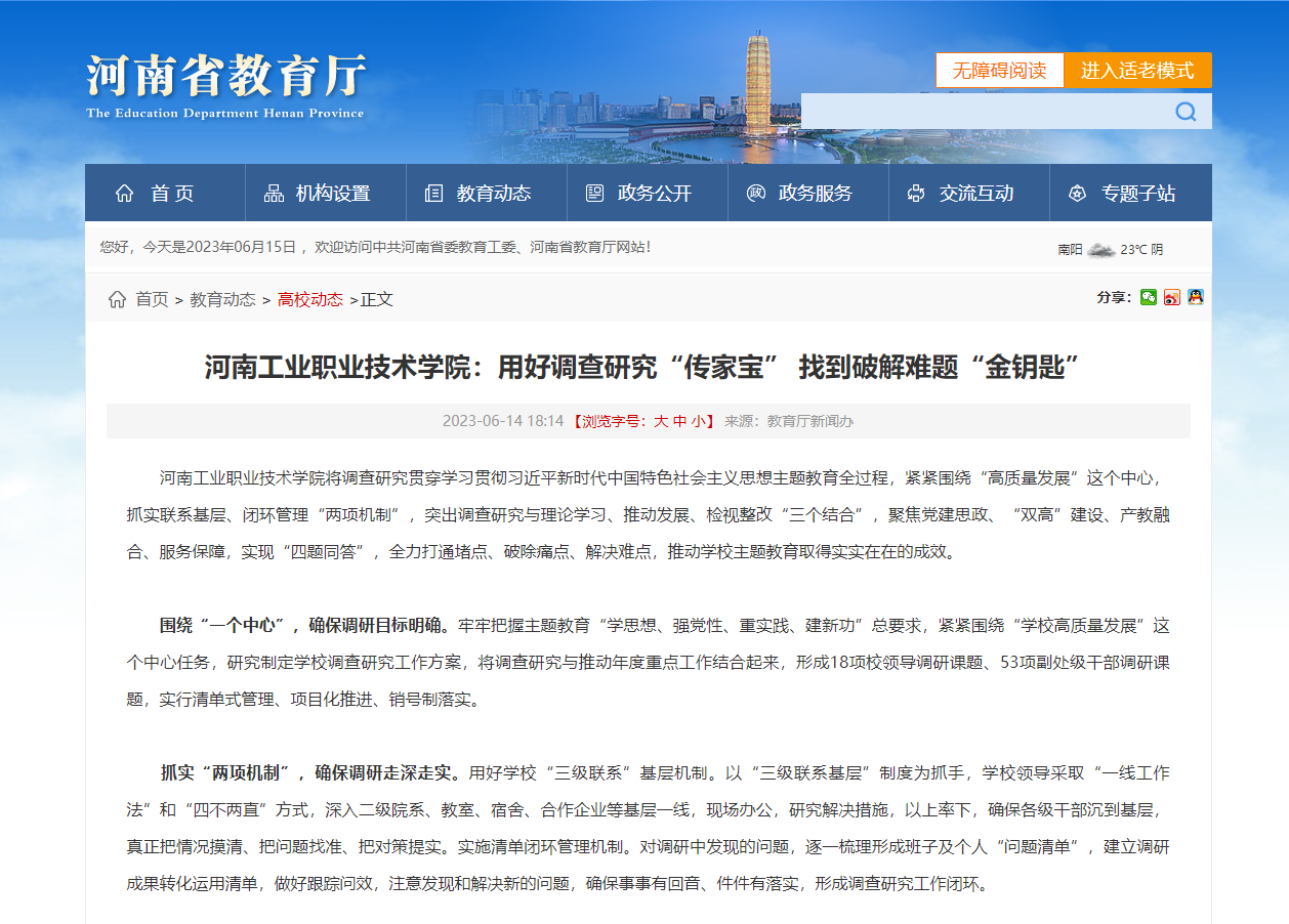 6月14日,河南省教育厅网站“高校动态”栏目以《用好调查研究“传家宝” 找到破解难题“金钥匙”》为题,刊发我校主题教育典型做法。全文如下:新葡的京集团8814vip:用好调查研究“传家宝” 找到破解难题“金