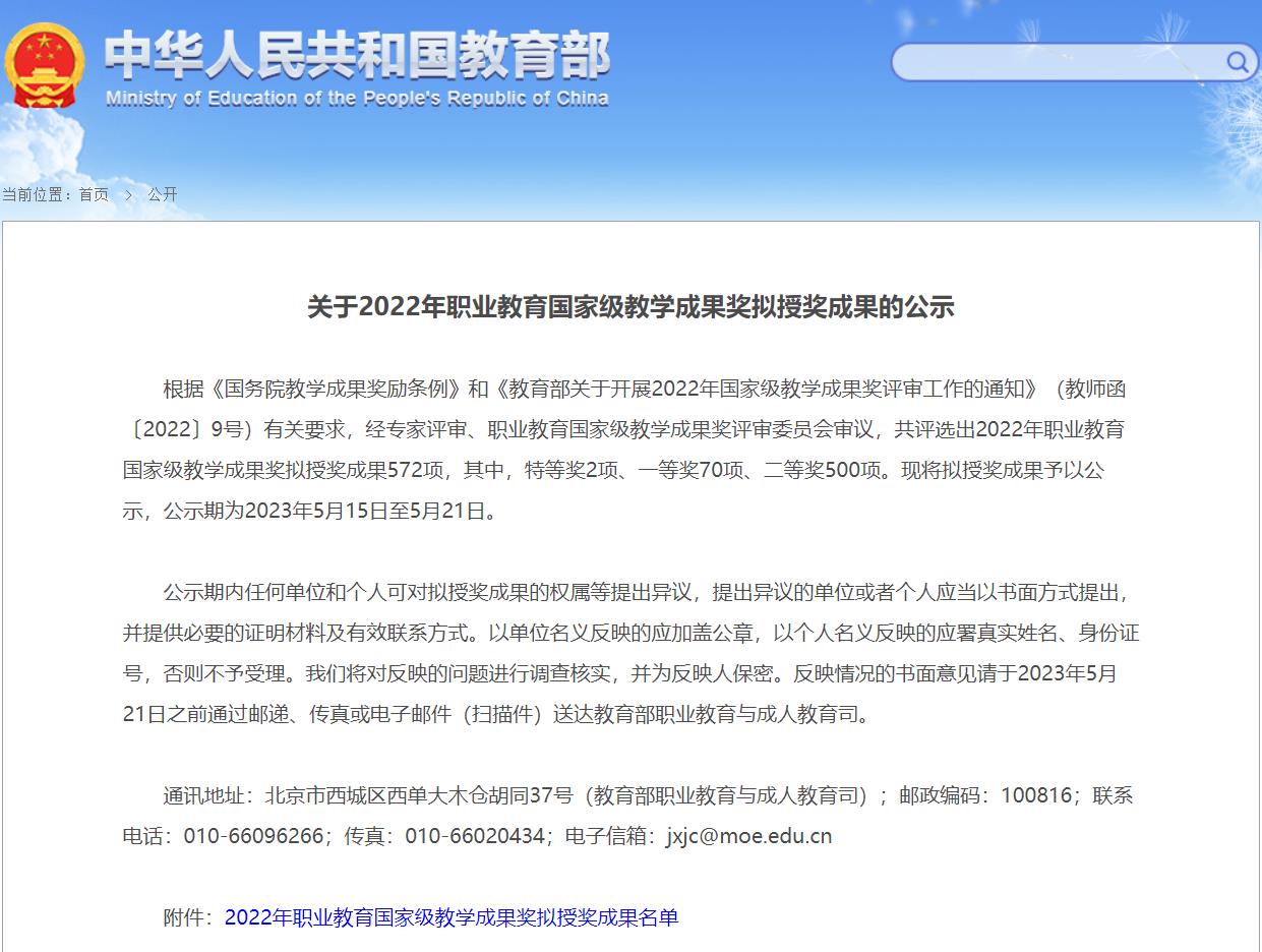 近日,教育部公示2022年职业教育国家级教学成果奖拟授奖成果名单,经专家评审、职业教育国家级教学成果奖评审委员会审议,共评选出2022年职业教育国家级教学成果奖拟授奖成果572项,其中,特等奖2项、一