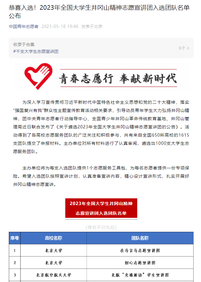 为深入学习宣传贯彻习近平新时代中国特色社会主义思想和党的二十大精神,落实“强国复兴有我”群众性主题宣传教育活动相关要求,引导动员青年学生大力弘扬井冈山精神,团中央青年志愿者行动指导中心、全国青少年井冈
