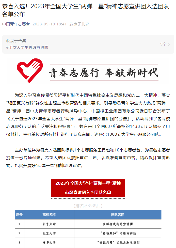 为深入学习宣传贯彻习近平新时代中国特色社会主义思想和党的二十大精神,落实“强国复兴有我”群众性主题宣传教育活动相关要求,引导动员青年学生大力弘扬“两弹一星”精神,4月26日,团中央青年志愿者行动指导中