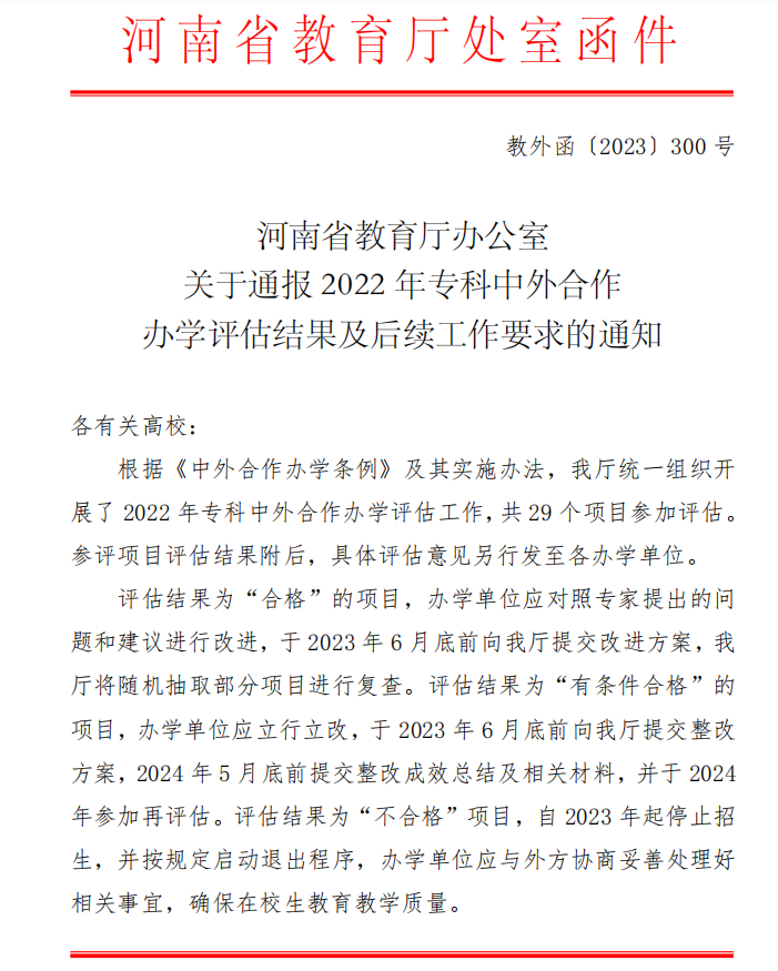 5月9日,河南省教育厅公布了2022年专科中外合作办学评估结果,2022年专科中外合作办学有29个项目参加评估,其中16个项目评估结果为“合格”,12个项目评估结果为“有条件合格”,1个项目评估结果为