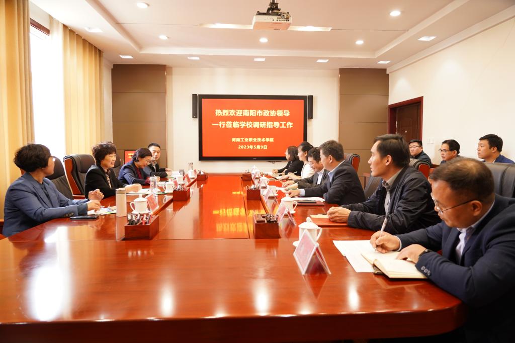 5月9日上午,市政协副主席、民盟南阳市委主委华道梅一行5人围绕“推动职业教育高质量发展,建设人力资源强市”主题到校调研。校领导王仁伟、马小兵及相关部门负责人、部分民主党派代表参加调研。华道梅一行参观了