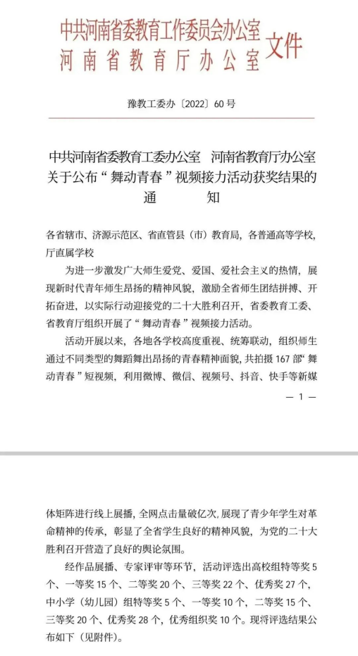近日,河南省委教育工委、河南省教育厅下发《中共河南省委教育工委办公室 河南省教育厅办公室关于公布“舞动青春”视频接力活动获奖结果的通知》,我校短视频作品《我们都是追梦人》荣获高校组二等奖,《灯火里的中