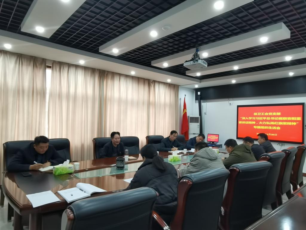 11月30日下午,保卫工会党支部在行政楼三楼会议室召开“深入学习习近平总书记视察安阳重要讲话精神、大力弘扬红旗渠精神”专题组织生活会,深入学习贯彻党的二十大和习近平总书记视察河南安阳重要讲话精神。支部
