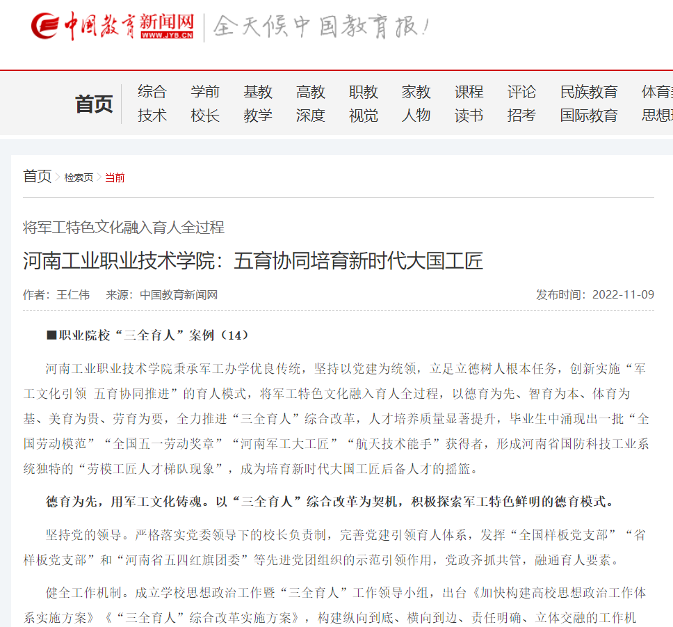 2022年,教育部办公厅、人社部办公厅印发《关于加强职业院校“三全育人”典型学校培育建设的通知》,组织开展了全国职业院校“三全育人”案例推荐工作,从全国各地选送的143例“三全育人”学校典型案例中,精