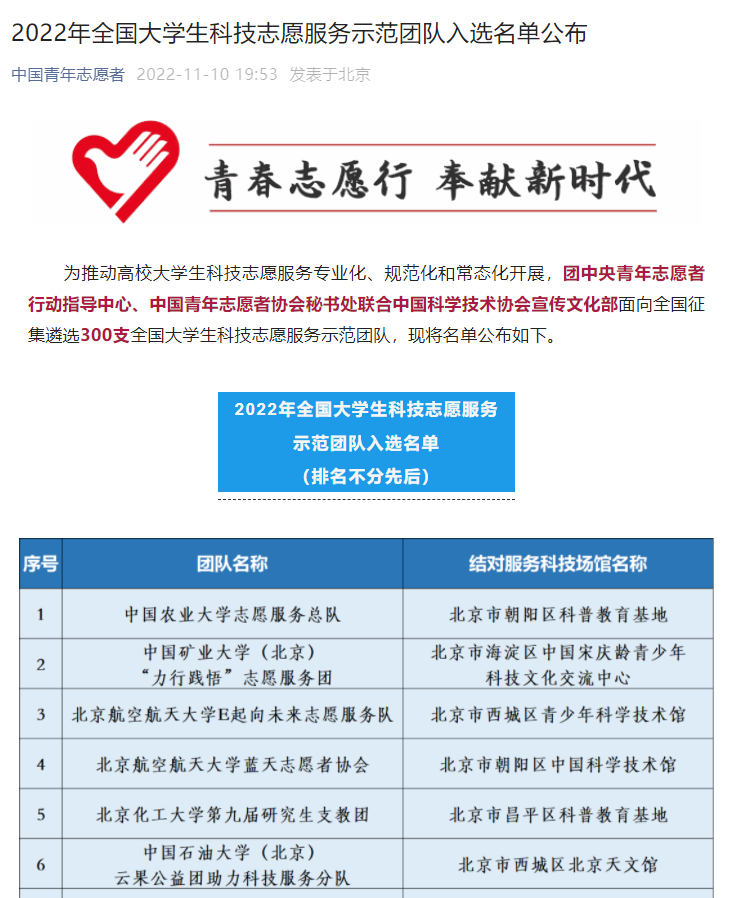 为推动高校大学生科技志愿服务专业化、规范化和常态化开展,团中央青年志愿者行动指导中心、中国青年志愿者协会秘书处联合中国科学技术协会宣传文化部面向全国征集遴选300支全国大学生科技志愿服务示范团队,我校