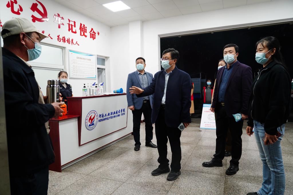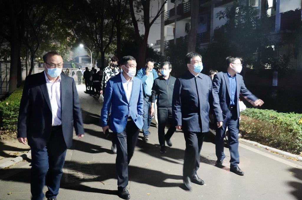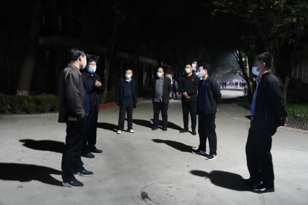 根据南阳市疫情防控工作安排,按照属地管理要求,学校实行静态管理。11月10日晚,党委书记温道军、校长王伟、党委副书记杜建根、纪委书记李荣胜,带领学校疫情防控九个工作专班负责人,深入孔明路校区,督查指导