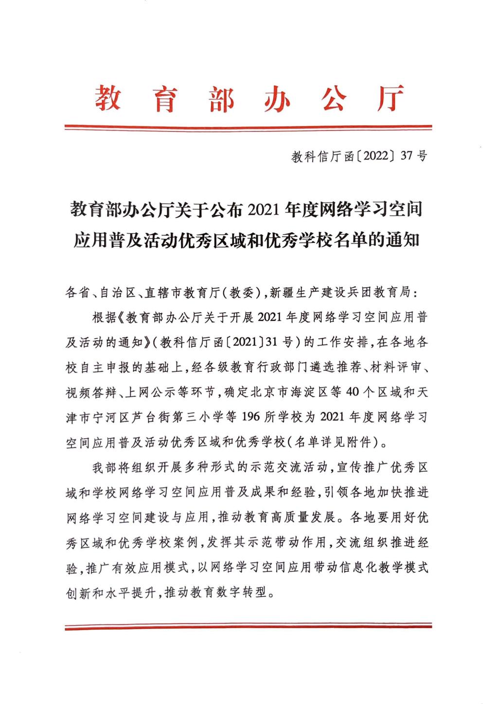 【喜报】我校荣获教育部“网络学习空间应用普及活动优秀学校”称号