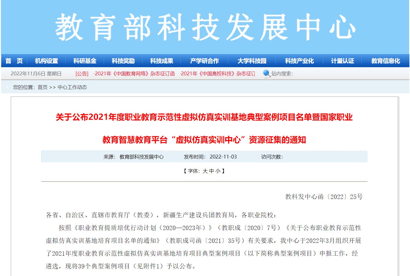 近日,教育部高等学校新葡的京集团8814检测站发展中心发布《关于公布2021年度职业教育示范性虚拟仿真实训基地典型案例项目名单暨国家职业教育智慧教育平台“虚拟仿真实训中心”资源征集的通知》,公布全国39个典型案例项目,