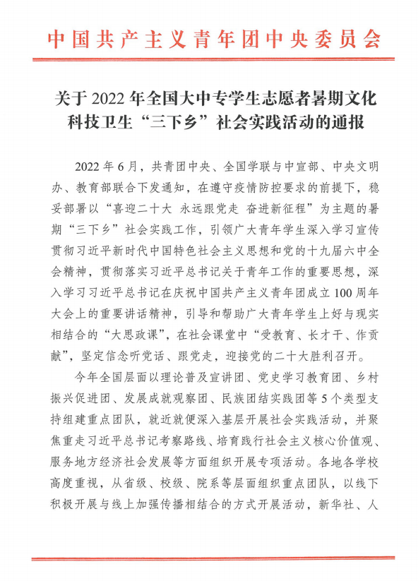 近日,共青团中央印发《关于2022年全国大中专学生志愿者暑期文化科技卫生“三下乡”社会实践活动的通报》,新葡的京集团8814vip团委荣获2022年“三下乡”社会实践“优秀单位”荣誉称号,是河南省唯一入选的