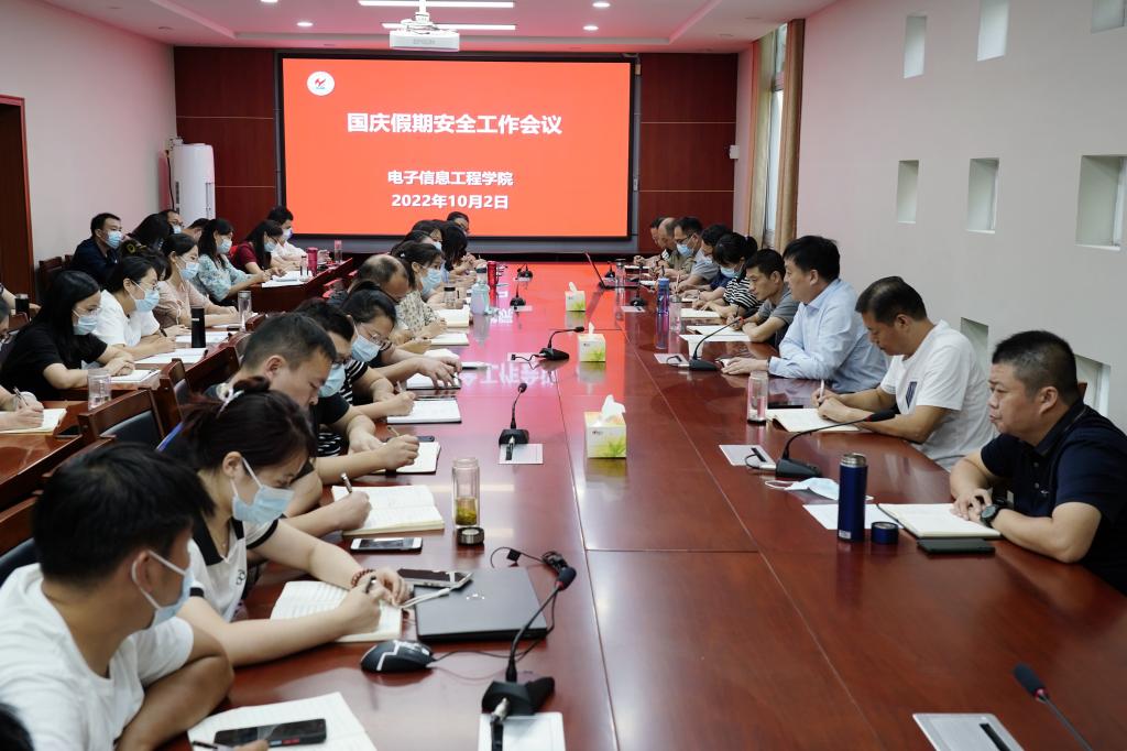 为深入贯彻落实河南省教育厅和学校国庆假期疫情防控和安全稳定的工作部署,10月2日下午,电子信息工程学院召开国庆假期安全稳定工作会议,学校党委书记温道军出席会议并指导工作,电子信息工程学院负责人和全体教