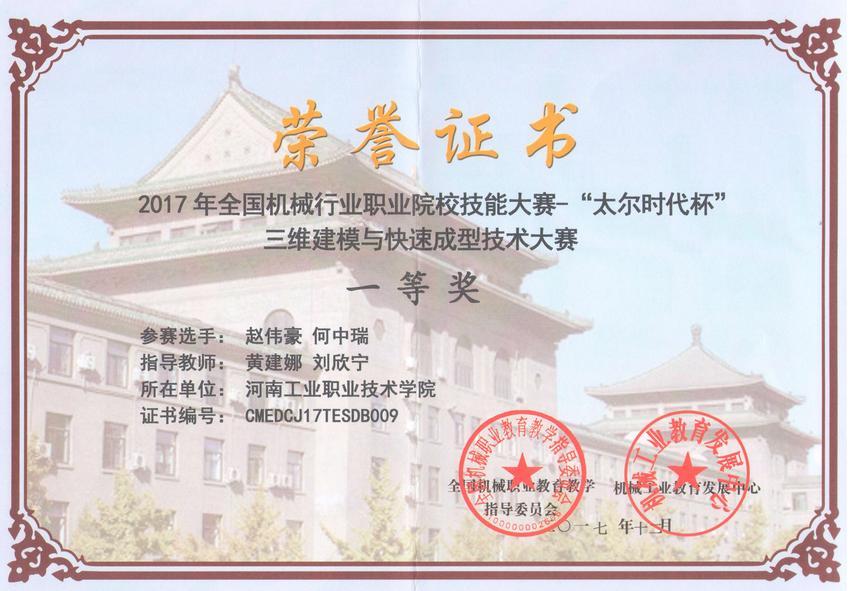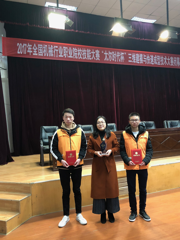 12月22-24日,全国机械行业职业院校技能大赛—“太尔时代杯”三维建模与快速成型技术大赛高职组在贵州电子信息职业技术学院举行。机械工程学院学生赵伟豪、何中瑞两位同学经过奋力拼搏,沉着迎战,最终以总分第四名的绝对优势获得大赛团体一等奖。指导教师黄建娜、刘欣宁由主办方授予“2017年全国机械行业职业院校技能大赛优秀指导老师”。