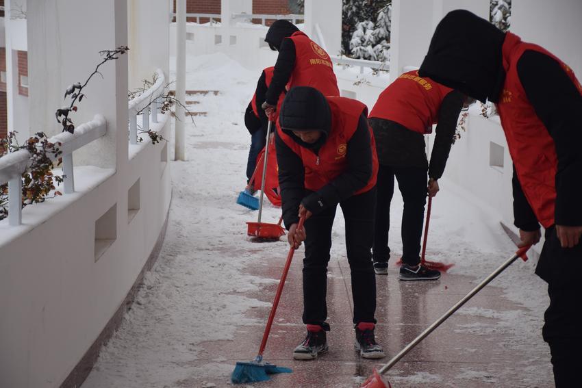 1月4日和5日一大早,机械工程学院团总支组织学生党员、学生干部和大学生志愿者有序的来到教学楼、实训楼连廊和办公楼周边开始了清扫。同学们不畏严寒、积极主动、相互配合、齐心协力,挥舞着铁锹、扫帚,一点点地将积雪和冰层铲起集中堆放,尽管同学们的手和脸被冻的通红,然而这一切丝毫没有影响大家的热情和工作效率,手中的扫雪工具不停地挥舞。两次的集中清扫,路面基本恢复了畅通,机械工程学院和其他兄弟单位一道,为广大师生安全出行进了份力,一条条清洁平整的路面蜿蜒在校园里,形成了初冬一道美丽的风景线。