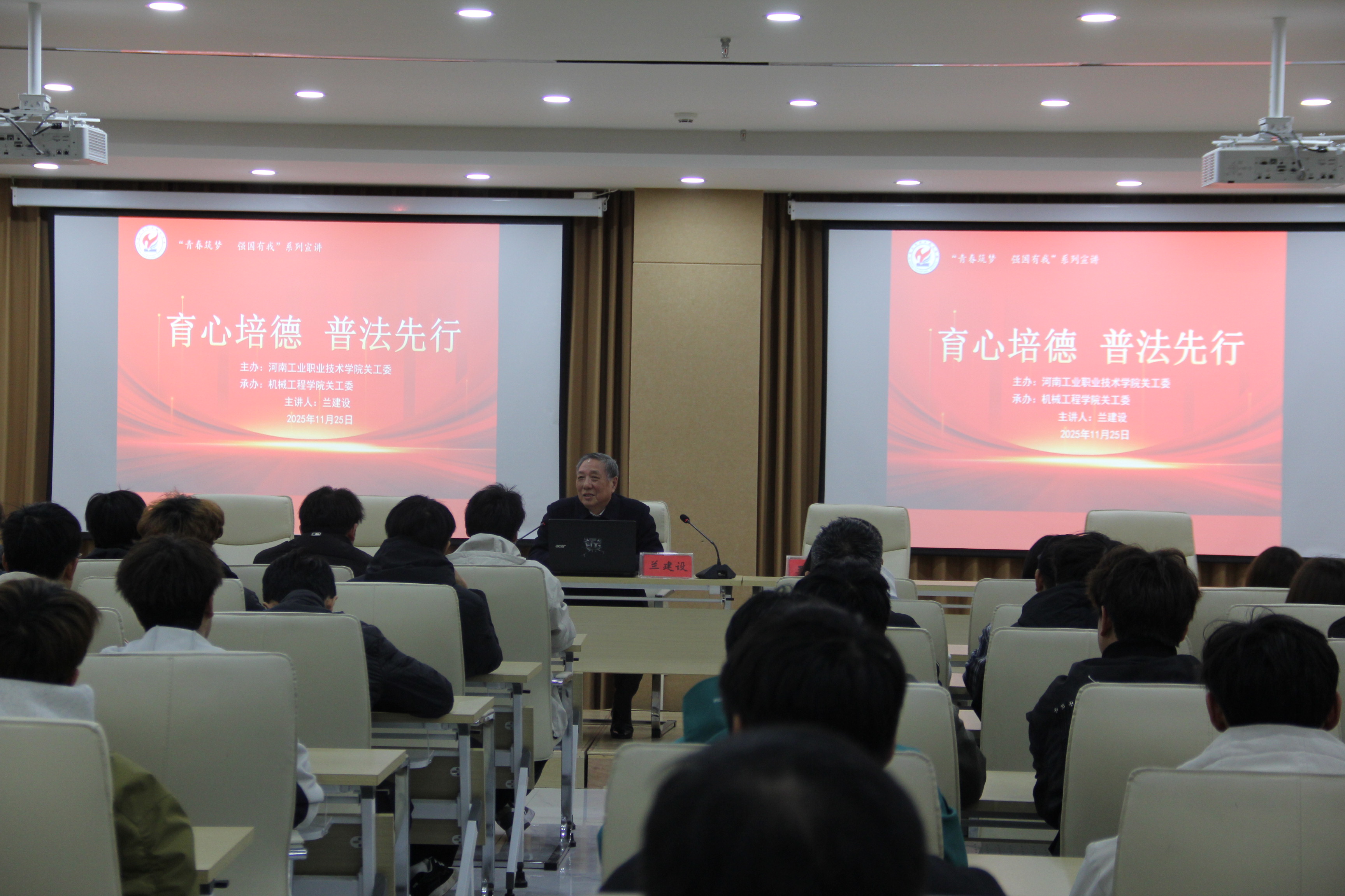 为加强青年学生思想道德建设,提升法治素养与心理健康水平,引导学生树立正确价值观,学校关工委组织开展“青春筑梦 强国有我”主题系列讲座,11月25日,特邀学校关心下一代工作委员会成员兰建设教授担任主讲嘉宾,本次讲座以“育心培德 普法先行”为主题,机械工程学院2025级、2024级学生代表参加。宣讲会由机械工程学院党总支副书记王俊京主持。
