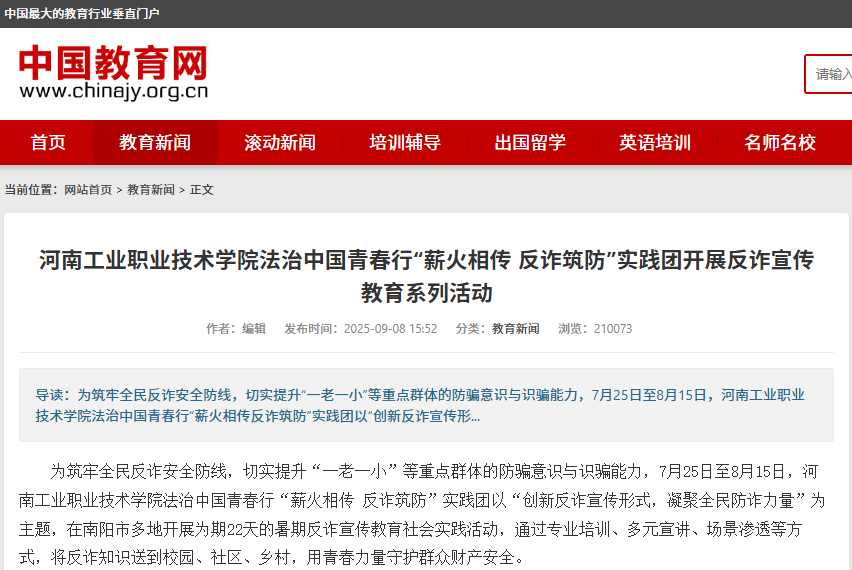 编者按:为深入贯彻党的二十大和二十届二中、三中全会精神,动员广大高校学生投身基层法治实践,共青团中央维护青少年权益部联合司法部普法与依法治理局、公安部禁毒局等部门开展“法治中国青春行”2025年暑期社会实践活动,经评审,遴选出87支团队,新葡的京集团8814vip“薪火相传 反诈筑防”社会实践团成功入选。9月8号以来,中国教育网、河南日报、中国日报、人民教育在线、今日头条等多家媒体对我校“薪火相传反诈筑防”实践团开展反诈宣传教育系列活动进行了宣传报道。(供稿/自动化工程学院 撰稿/岳鹏飞 单位审核/王兴举 编审/杨爽)网址链接中国教育网https://www.chinajy.org.cn/article/7694.html河南日报https://m.topnews.cn/hnrbnews/145BD4E047BB4A72中国日报网https://cn.chinadaily.com.cn/a/202509/08/WS68 be77aba310f0725774740b.html人民教育在线http://www.renminjiaoyuzaixian.cn/?gongyizai xian/8785