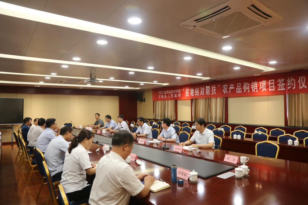 9月11日,校长王伟、工会主席屈保中带领党政办、组织部、宣传部、后勤服务中心相关人员,在方城县第一宾馆,举行了“校地结对帮扶”农产品购销项目签约仪式。方城县县长段文汉,县委常委、常务副县长孙大明,县委常委、副县长李荣胜,副县长董玉坤、县政府党组成员胡凤洲、县政府党组成员、公安局长侯大同和方城县扶贫办、二郎庙镇、博望镇、政府办、农业农村局、产业集聚区等单位主管领导及企业代表出席签约仪式,副县长李荣胜主持签约仪式。