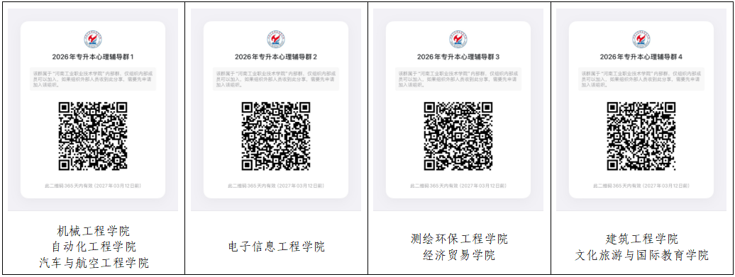 请各学院高度重视,安排专人负责,通知专升本学生扫对应二维码提前进群,确保考生按时参加讲座,并在培训期间做好考勤管理。