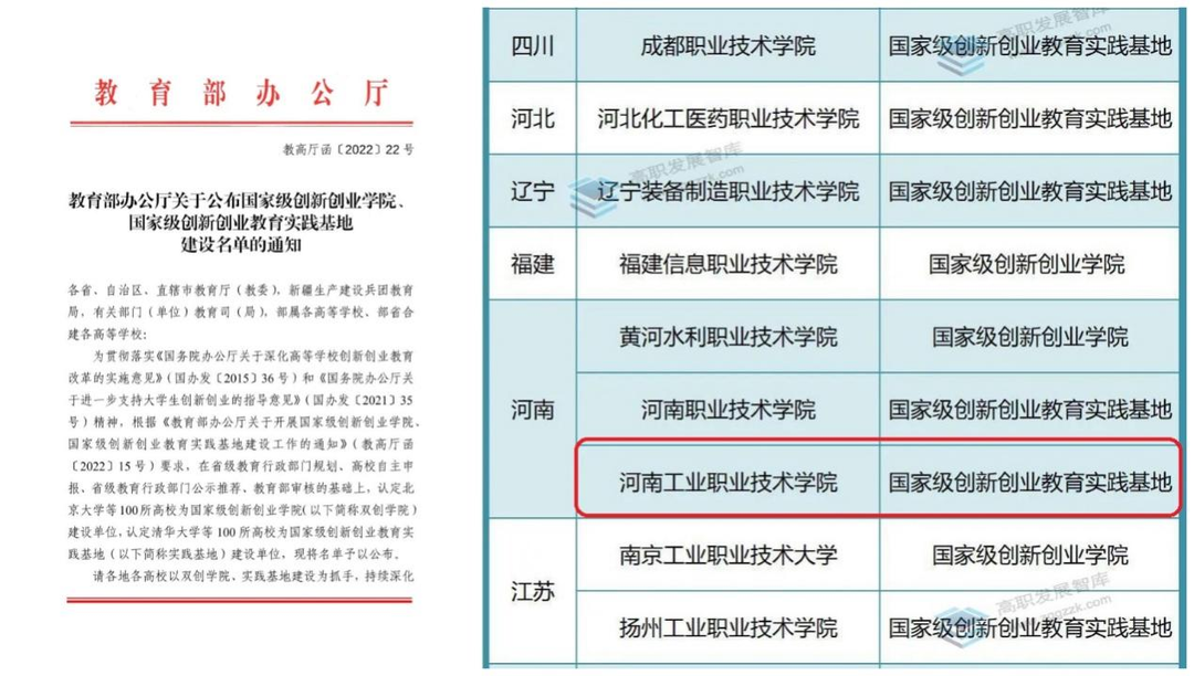 2022年8月31日,教育部办公厅印发《关于公布国家级创新创业学院、国家级创新创业教育实践基地建设名单的通知》,认定北京大学等100所高校为国家级创新创业学院建设单位,认定清华大学等100所高校为国家级创新创业教育实践基地建设单位,我校入选首批国家级创新创业教育实践基地建设单位。