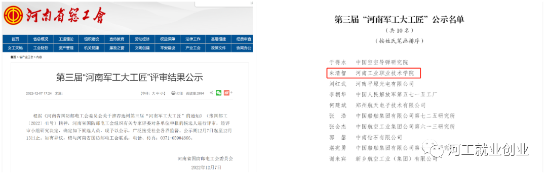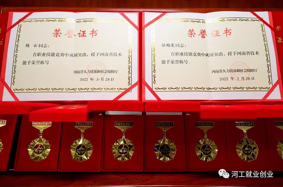 2022年3月,河南省人力资源和社会保障厅发布《关于授予2021年度职业技能竞赛优秀选手河南省技术能手荣誉的决定》,我校连晗、庞士昱、梁俊娟、任越美、田磊、杨云、邢鹏康、曹建生、董珍珍、李润钺、李祯、郭东阳、王景,在全省2021年度职业技能竞赛中成绩卓著,被授予“河南省技术能手”荣誉称号。2022年4月,南阳市总工会印发《关于表彰2022年南阳市五一劳动奖和工人先锋号的决定》,我校刘清文、盛青山、赵丹丹三位教师荣获南阳市五一劳动奖章。2022年10月,南阳市总工会印发《关于命名2021年南阳市示范性劳模和工匠人才创新工作室的决定》,我校朱清智、盛青山创新工作室榜上有名。2022年12月,河南省国防邮电工会委员会印发《关于命名河南省国防邮电系统职工创新工作室的决定》,我校马磊娟创新工作室、李仁创新工作室、郭仓库创新工作室和张丽曲令晋联合创新工作室成功获得命名。同月,印发《关于命名第三届“河南军工大工匠”的决定》,我校教师朱清智荣获“河南军工大工匠”称号。
