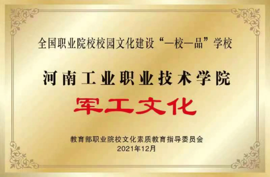 2022年1月4日,教育部职业院校文化素质教育指导委员会公布2021年全国职业院校校园文化建设“一校一品”评选结果,我校申报的“军工文化”校园文化品牌,经专家评议、专家复评、校园文化建设专门委员会会评、教指委审定,成功入选2021年全国职业院校校园文化“一校一品”学校。