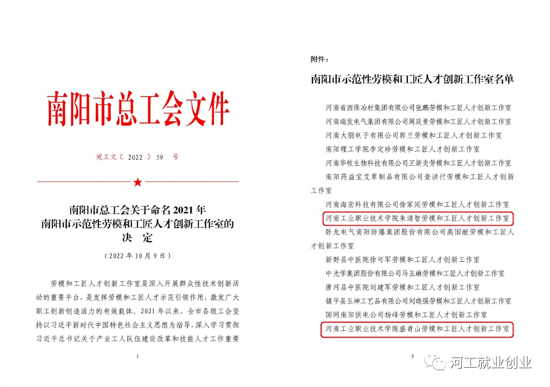 2022年3月,河南省人力资源和社会保障厅发布《关于授予2021年度职业技能竞赛优秀选手河南省技术能手荣誉的决定》,我校连晗、庞士昱、梁俊娟、任越美、田磊、杨云、邢鹏康、曹建生、董珍珍、李润钺、李祯、郭东阳、王景,在全省2021年度职业技能竞赛中成绩卓著,被授予“河南省技术能手”荣誉称号。2022年4月,南阳市总工会印发《关于表彰2022年南阳市五一劳动奖和工人先锋号的决定》,我校刘清文、盛青山、赵丹丹三位教师荣获南阳市五一劳动奖章。2022年10月,南阳市总工会印发《关于命名2021年南阳市示范性劳模和工匠人才创新工作室的决定》,我校朱清智、盛青山创新工作室榜上有名。2022年12月,河南省国防邮电工会委员会印发《关于命名河南省国防邮电系统职工创新工作室的决定》,我校马磊娟创新工作室、李仁创新工作室、郭仓库创新工作室和张丽曲令晋联合创新工作室成功获得命名。同月,印发《关于命名第三届“河南军工大工匠”的决定》,我校教师朱清智荣获“河南军工大工匠”称号。