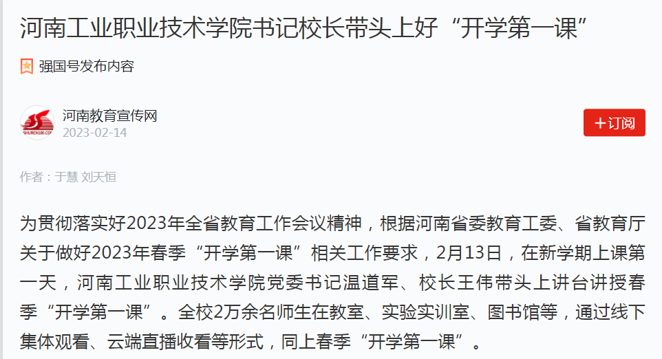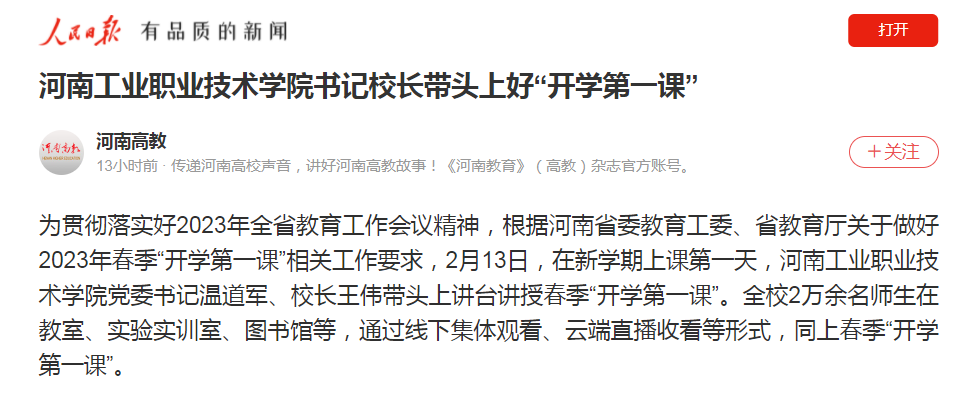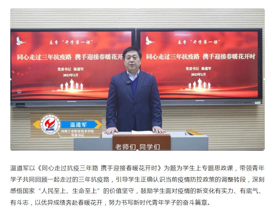 编者按:为贯彻落实好2023年全省教育工作会议精神,根据河南省委教育工委、省教育厅关于做好2023年春季“开学第一课”相关工作要求,2月13日,在新学期上课第一天,学校党委书记温道军、校长王伟带头上讲台讲授春季“开学第一课”,全校2万余名师生在教室、实验实训室、图书馆等,通过线下集体观看、云端直播收看等形式,同上春季“开学第一课”。近日,人民日报、学习强国、河南日报、河南高教等媒体对学校书记校长带头上好“开学第一课”进行广泛报道。(供稿/党委宣传部 撰稿/于慧 单位审核/杨俊峰 编审/杨爽)