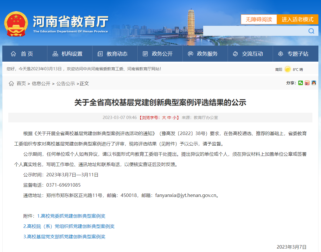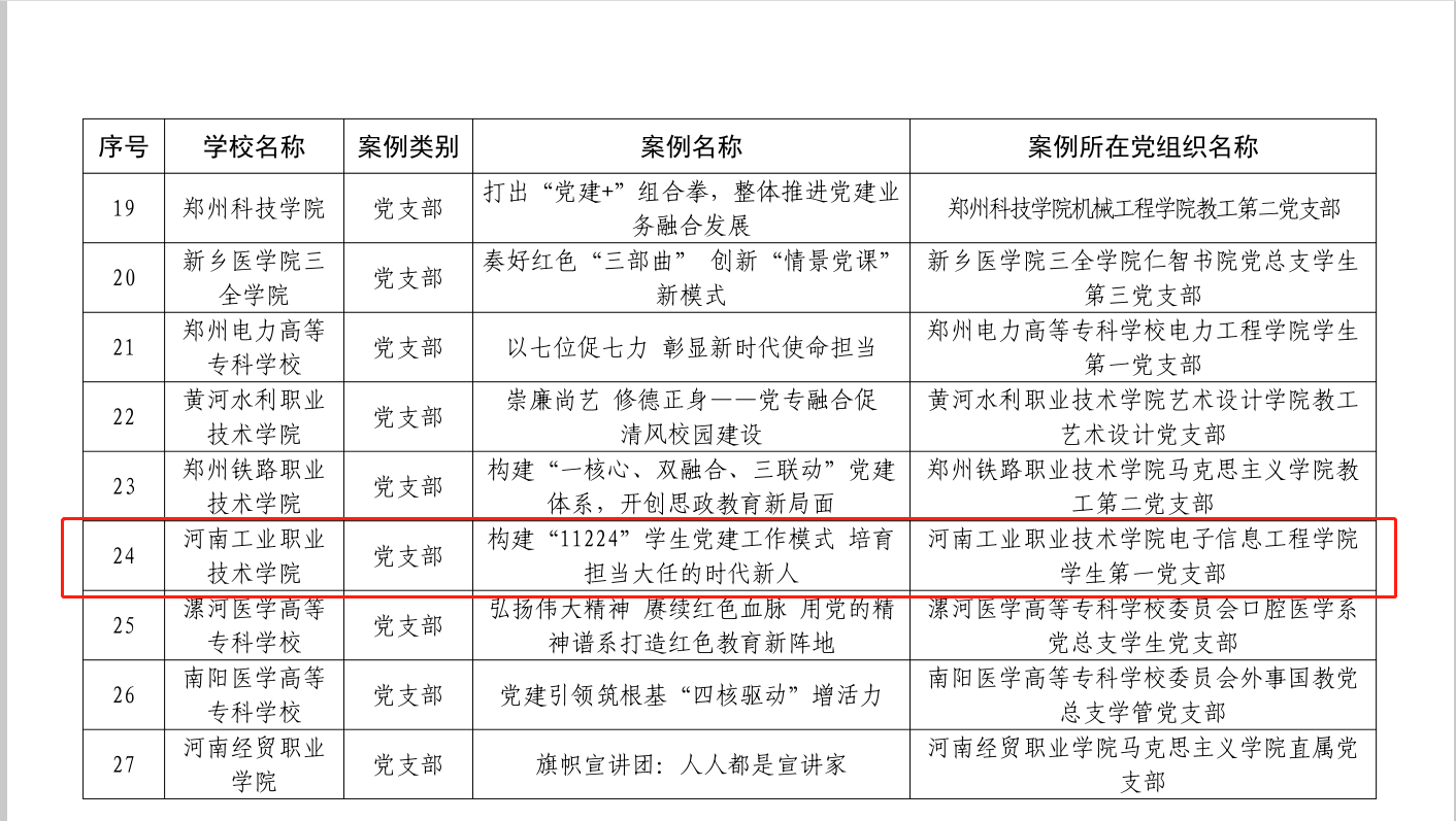 近日,中共河南省委教育工委、河南省教育厅公布2022年全省高校基层党建创新典型案例评选结果,我校电子信息工程学院学生第一党支部的《构建“11224”学生党建工作模式 培育担当大任的时代新人》案例荣获全省高校基层党支部抓党建创新典型案例奖。