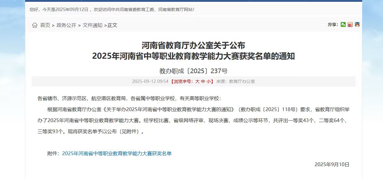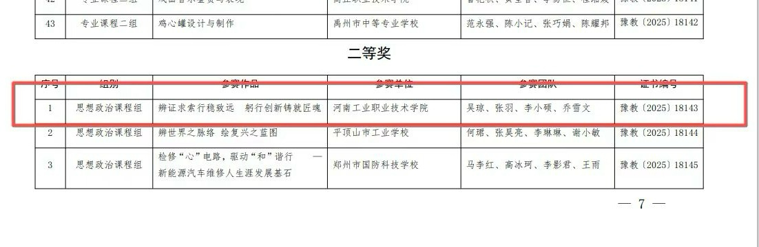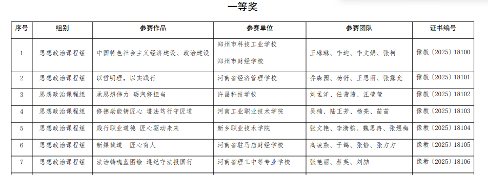 根据《河南省教育厅办公室关于举办2025年河南省中等职业教育教学能力大赛的通知》精神,广大教师踊跃报名参加。在2025年度河南省中等职业教育教学能力大赛中,我院选派的两支参赛团队均取得优异成绩。其中,吴楠、陆正芳、杨亮、苗苗团队凭借作品《修德励能铸匠心 遵法笃行守匠道》荣获省级一等奖《职业道德与法治》课程组第一名的成绩;吴琼、张羽、李小硕、乔雪文团队凭借作品《辩证求索行稳致远 躬行创新铸就匠魂》获得省级二等奖《哲学与人生》课程组第一名的优异成绩。