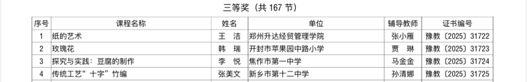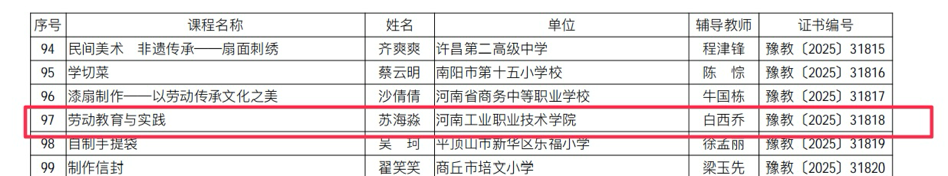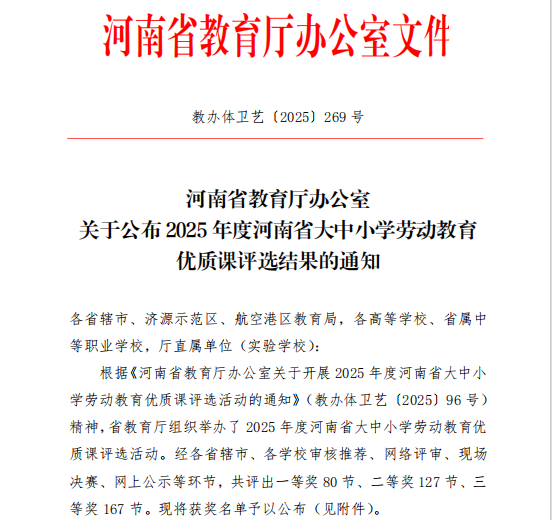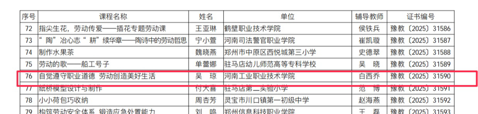 根据《河南省教育厅办公室关于开展2025年度河南省大中小学劳动教育优质课评选活动的通知》精神,教师踊跃参赛。在河南省大中小学劳动教育优质课评选中,吴琼老师讲授的《自觉遵守职业道德 劳动创造美好生活》课程荣获省级一等奖,苏海淼老师讲授的《劳动教育与实践》课程获得省级三等奖。