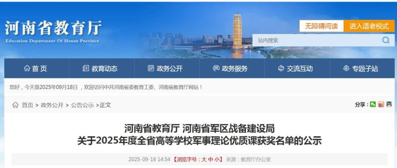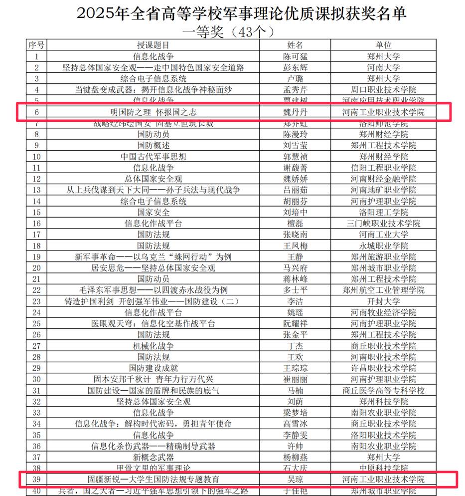 根据《河南省教育厅、河南省军区战备建设局关于开展2025年度全省高等学校军事理论优质课征集活动的通知》精神,广大教师积极参加。在2025年度河南省高等学校军事理论优质课评选活动中,我院教师魏丹丹作品《明国防之理 怀报国之志》和吴琼作品《固疆新锐—大学生国防法规专题教育》,双双荣获省级一等奖。