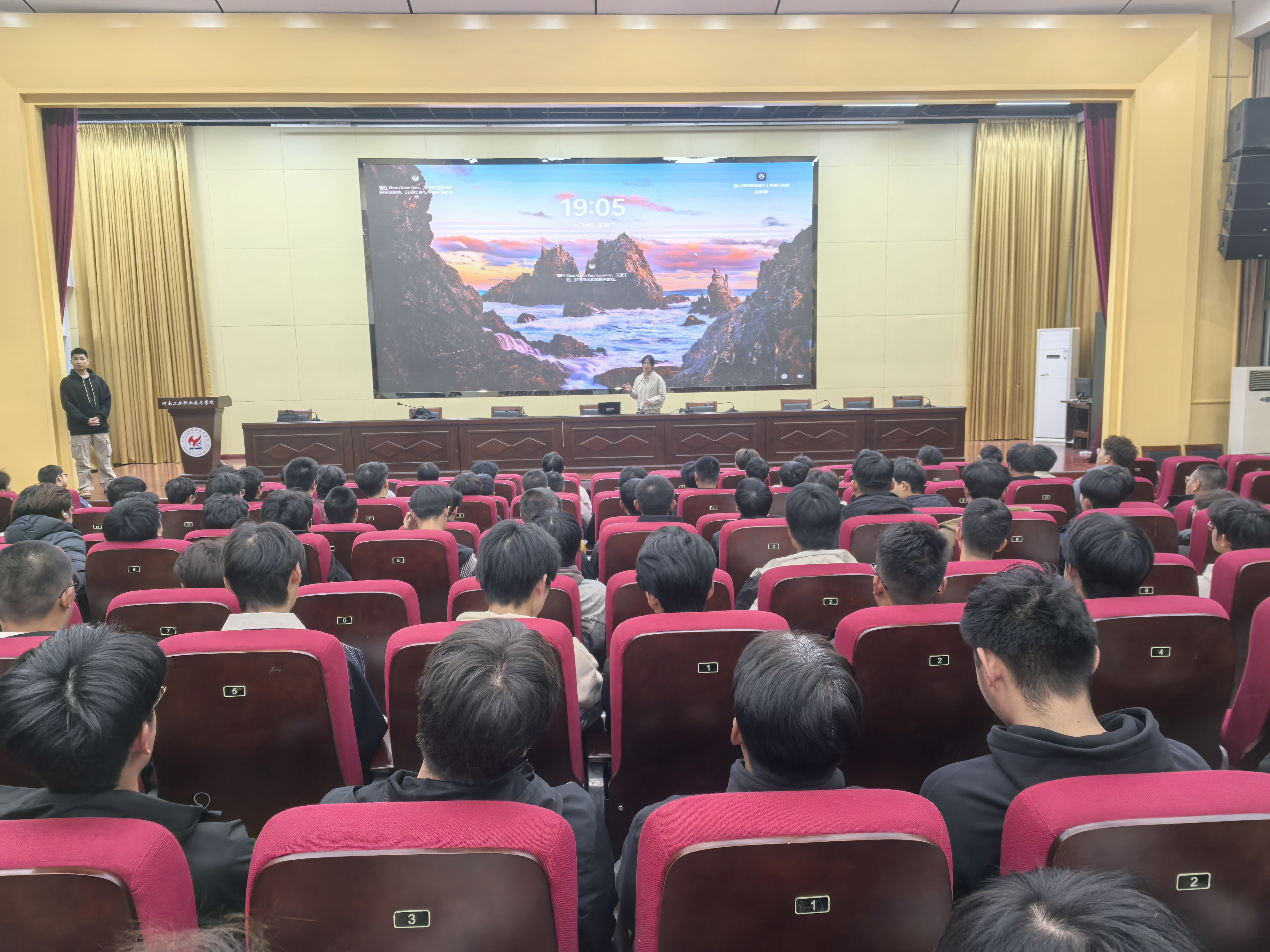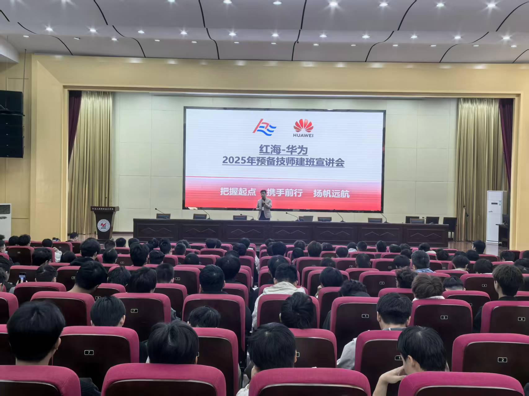 12日14:30,2025级华为制造预备技师班建班宣讲会在学校大学术报告厅举行,来自机械工程学院2025级的180余名同学参加了宣讲会。红海人力资源集团股份有限公司校企负责人李鹏介绍了华为的发展历史、预备技师班的优势及薪资待遇等方面内容。