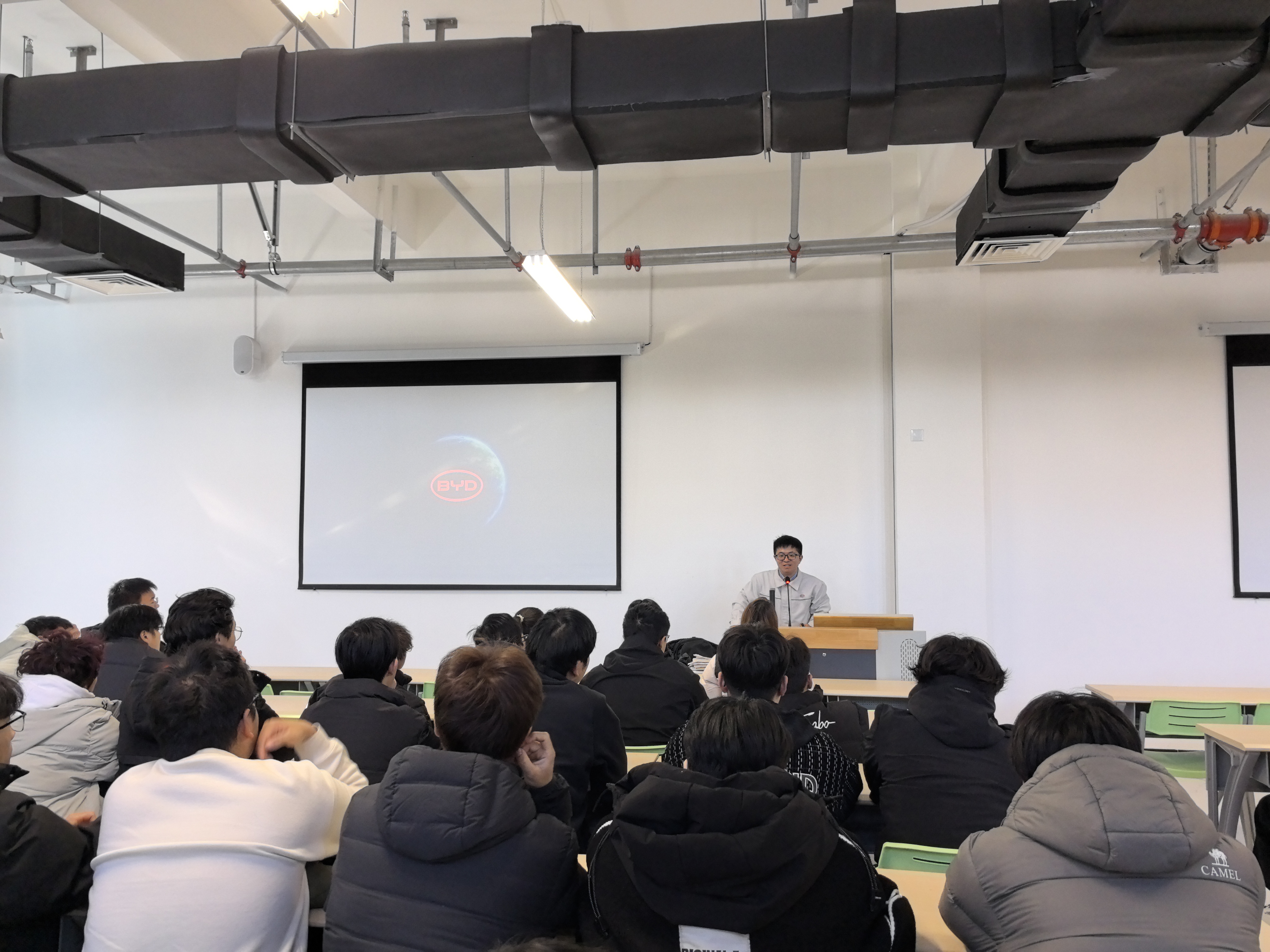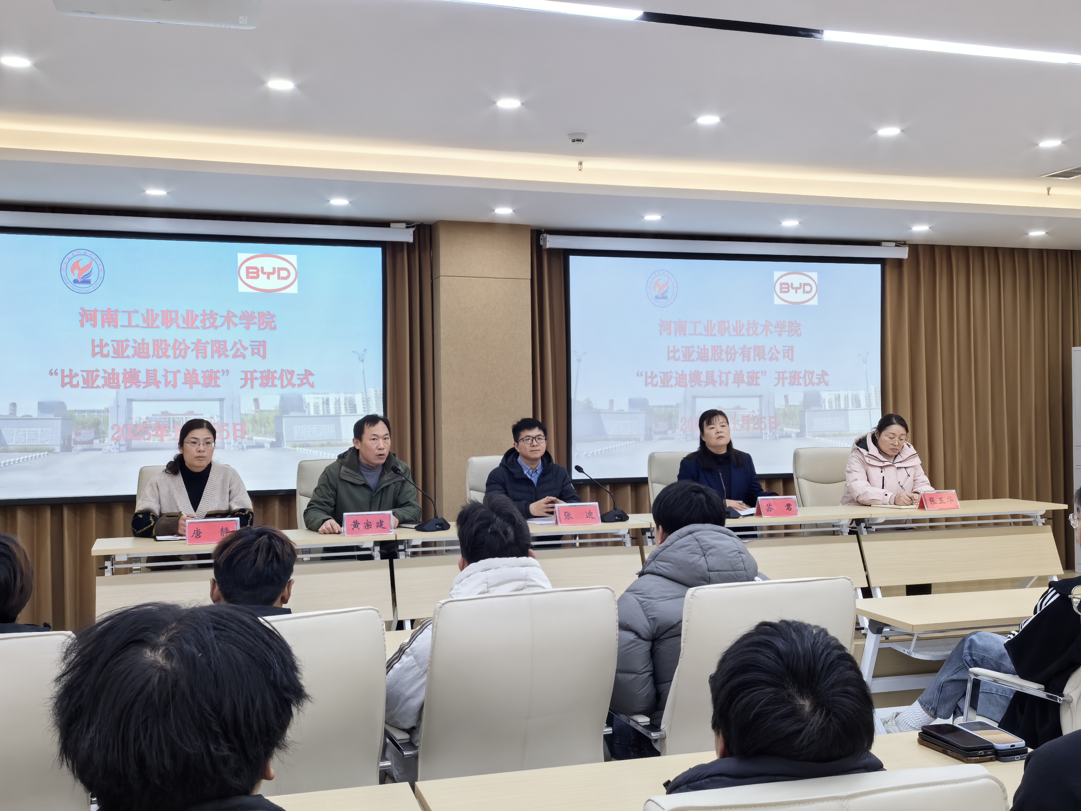 为了深化产教融合,11月25日下午,新葡的京集团8814vip与全球新能源汽车领军企业比亚迪公司合作共建的“比亚迪模具订单班”开班仪式在惟实楼707隆重举行。此举标志着我校在深化产教融合、创新人才培养模式上迈出了坚实一步,为学子们搭建了从校园直通名企的“就业直通车”。郑州比亚迪汽车股份有限公司人力资源部招聘经理张迪、机械工程学院党总支书记苏君、机械工程学院副院长黄宗建、学院代表教师和首批经过严格选拔的“比亚迪模具订单班”全体学员共同出席了此次盛会。仪式由黄宗建主持。