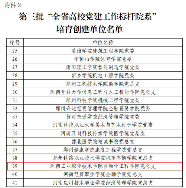 近日,中共河南省委教育工作委员会办公室下发《关于公布全省教育系统党建强基引领“三级联创”和第三批高校“双带头人”教师党支部书记工作室评选结果的通知》(豫教工委办〔2025〕37 号),我校自动化工程学院党总支入选“全省高校党建工作标杆院系”培育创建单位、机械工程学院学生第二党支部入选“全省高校党建工作样板支部”培育创建单位。
